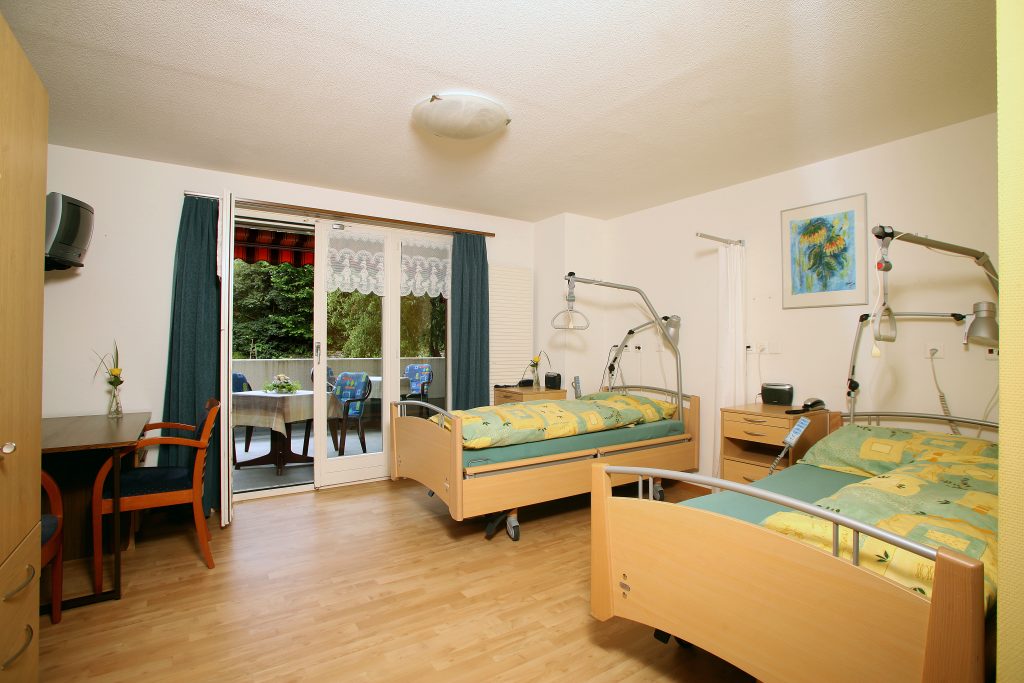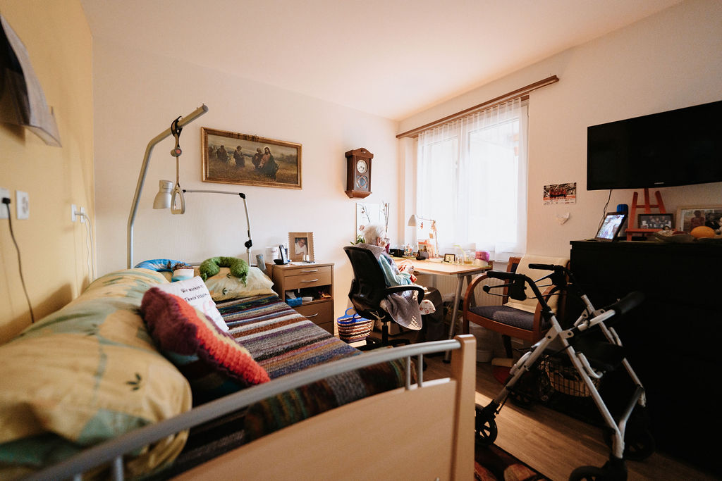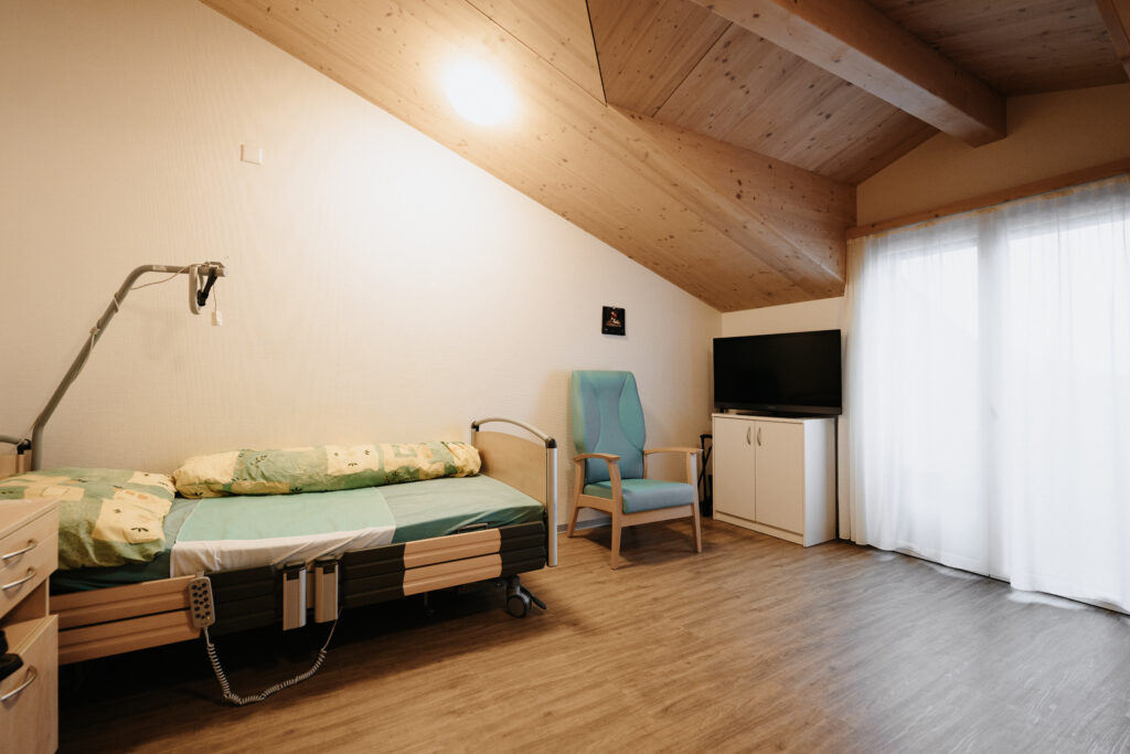 Unsere Zimmer sind geräumig und heimelig gestaltet und bieten den Bewohnerinnen und Bewohnern ein angenehmes, sicheres Wohnumfeld. Die Einrichtung ist zweckmäßig und umfasst unter anderem ein modernes Pflegebett sowie einen Notruf, der jederzeit Sicherheit gewährleistet.